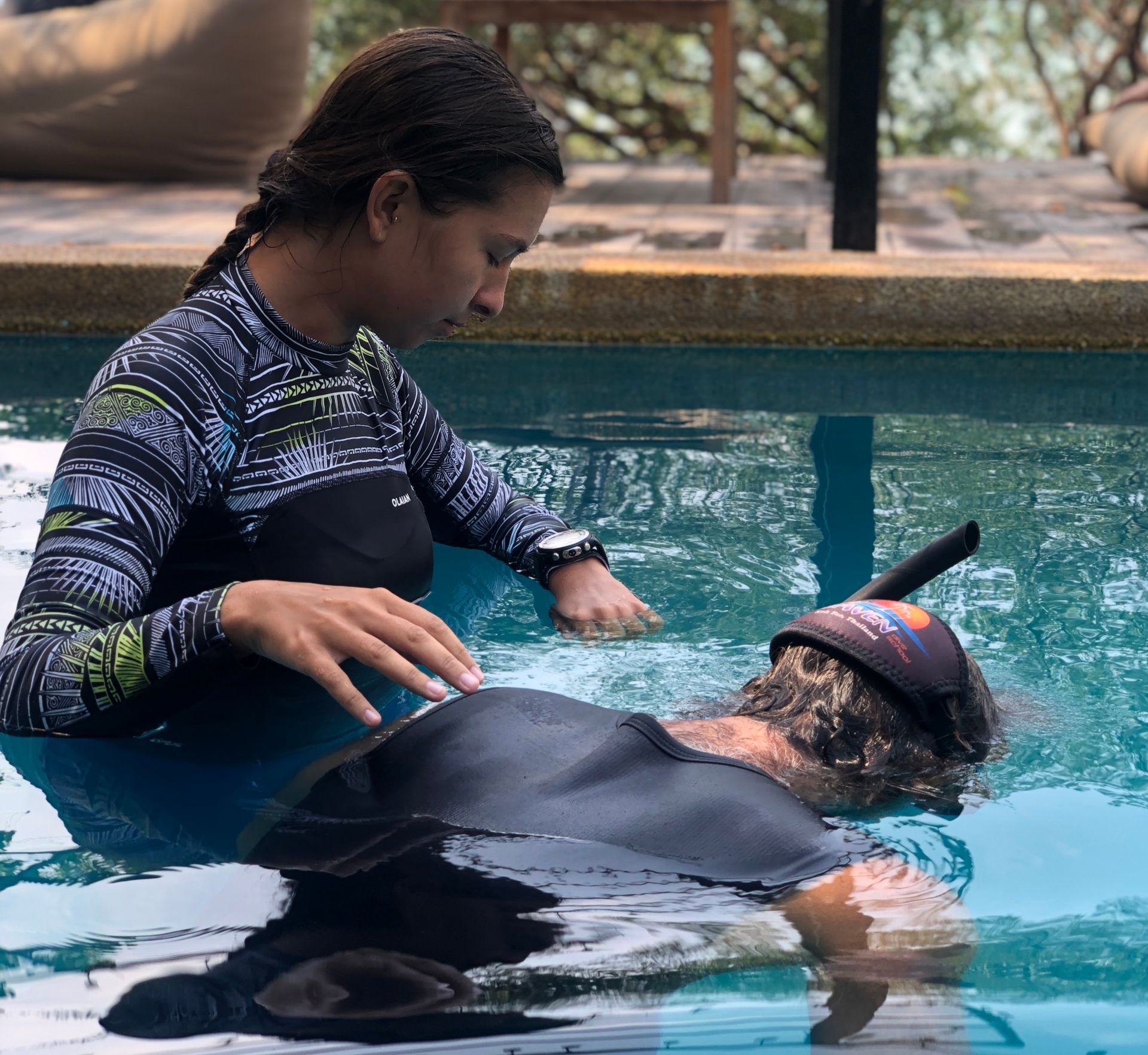 Hi, my name is Julia. I am the freediving instructor at Dive Academy. Embarking on my freediving journey feels like a natural progression from my childhood, surrounded by the underwater world. With a scuba instructor dad, I found solace beneath the waves early on, laying the foundation for my love of freediving.